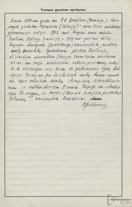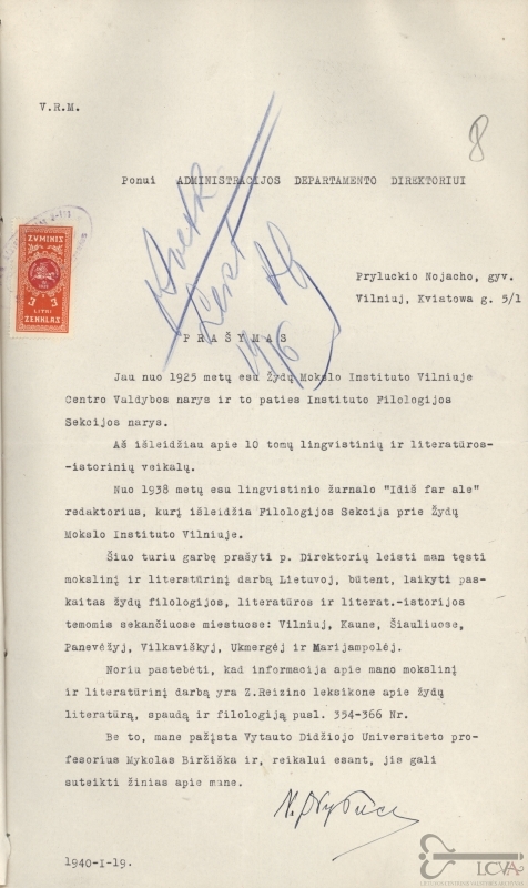 Associate Professor Noachas Pryluckis (1882-1941) received legal education, but became one of the most recognised specialists in the Yiddish language in the interwar Europe and was acknowledged as a pioneer in the field of Yiddish dialectology. Coming from the intellectual milieu of Warsaw, he fled to Vilnius as a refugee of the Second World War. He became the head of the Department of Yiddish Philology at Vilnius University, and from January 1941 he was the last director of the famous YIVO institute (Jidishe Visnshaftlecher Institut) in Vilnius, which was relocated to New York City during the war. During the Nazi occupation, on 22 June 1941, he was fired from Vilnius University following the order of the Governor of Education Affairs of Vilnius and the Vilnius Region. He was killed in Vilnius.