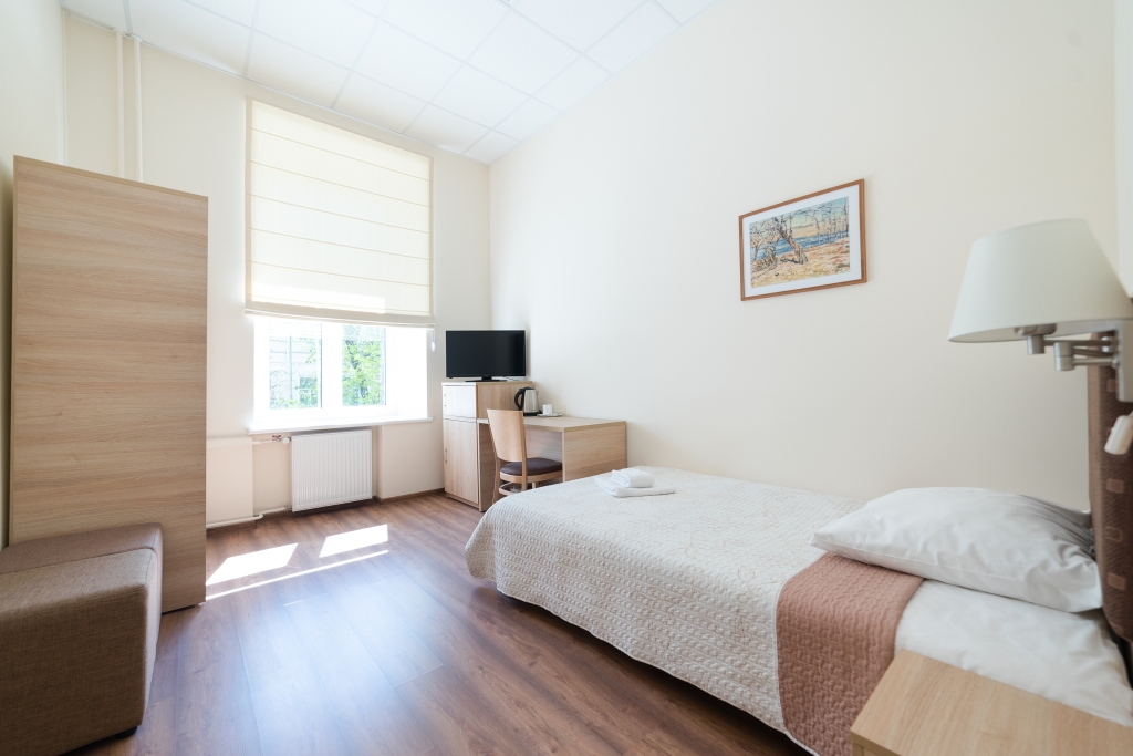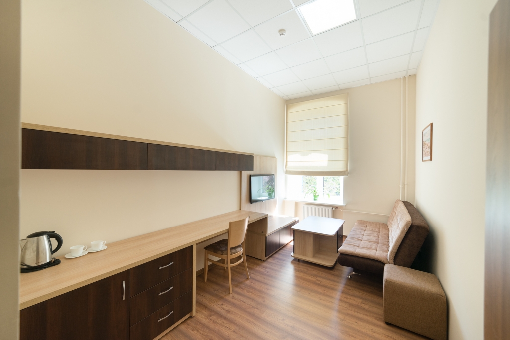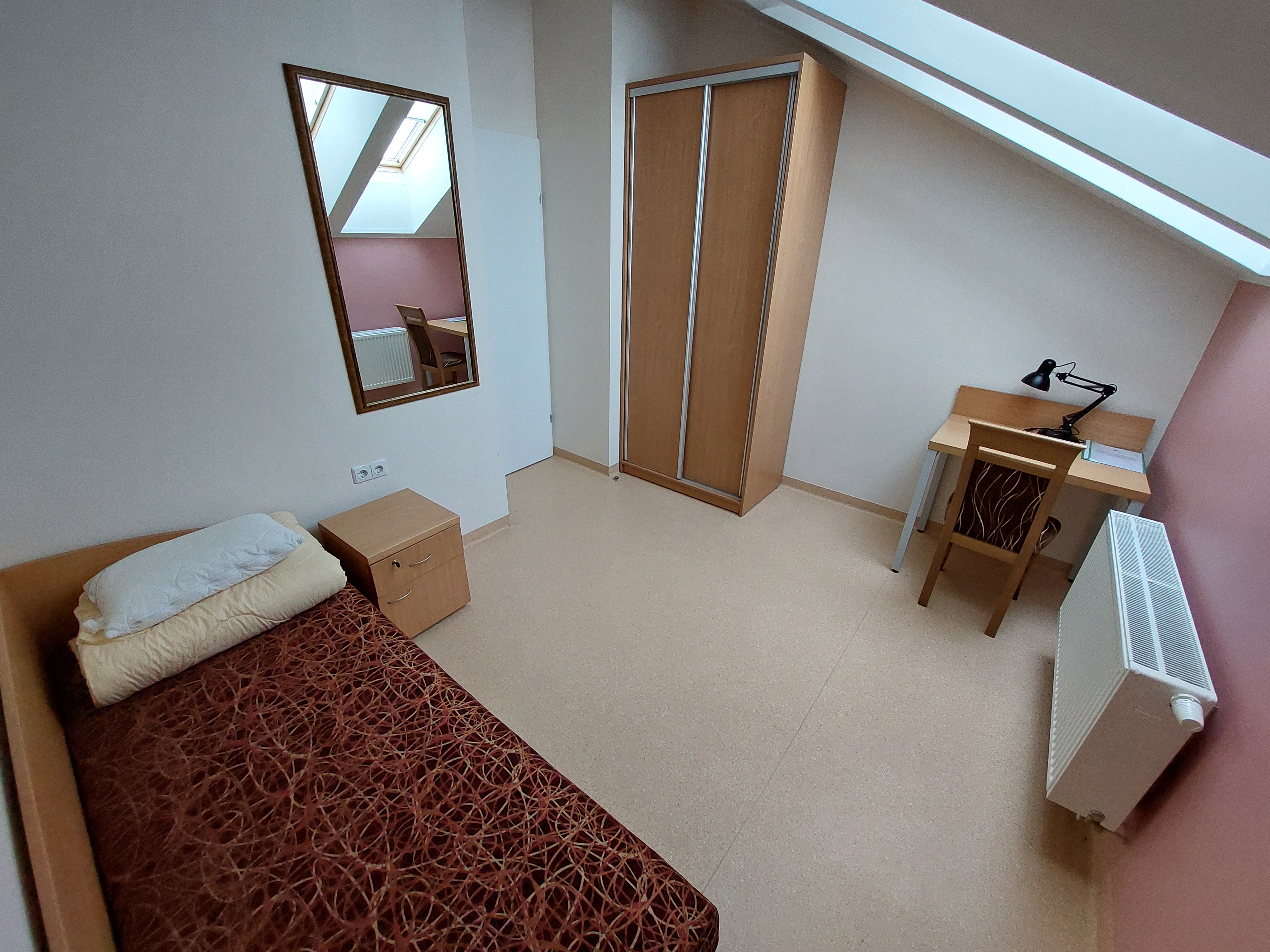 Trečiame aukšte vienviečiuose, dviviečiuose ir sublokuotuose (vienvietis ir dvivietis) kambariuose yra dušai ir tualetai, kiekviename kambaryje – spintos stumdomomis durimis, veidrodžiai.