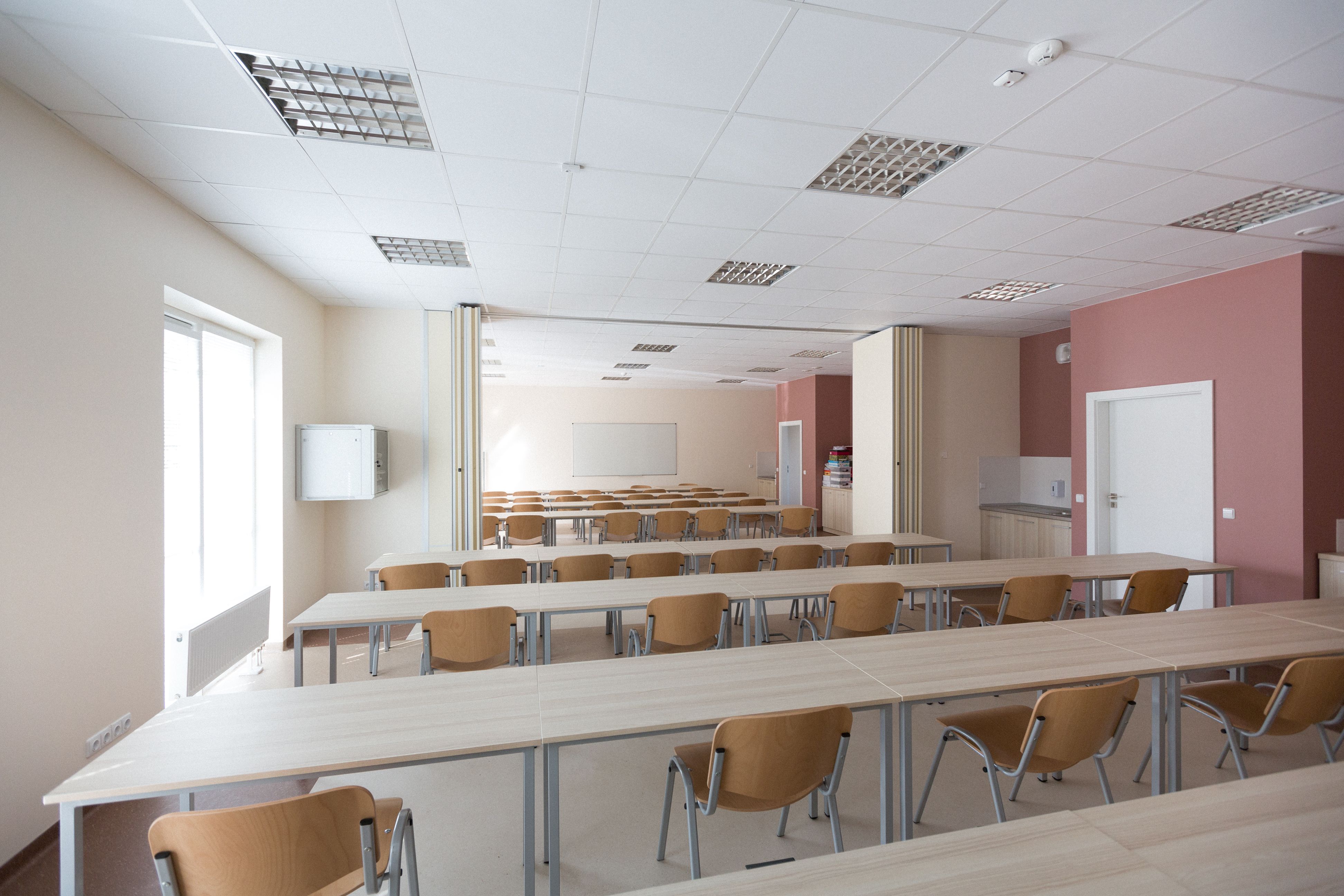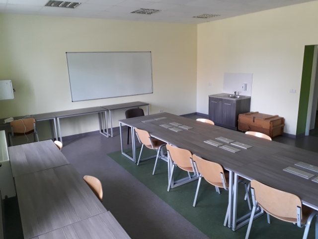 Pirmame pastato aukšte – mokymams, studentų laboratorijoms skirti kambariai ir didelė auditorija– konferencijų salė su projektoriumi. Iš salės galima išeiti tiesiai į lauko terasą.