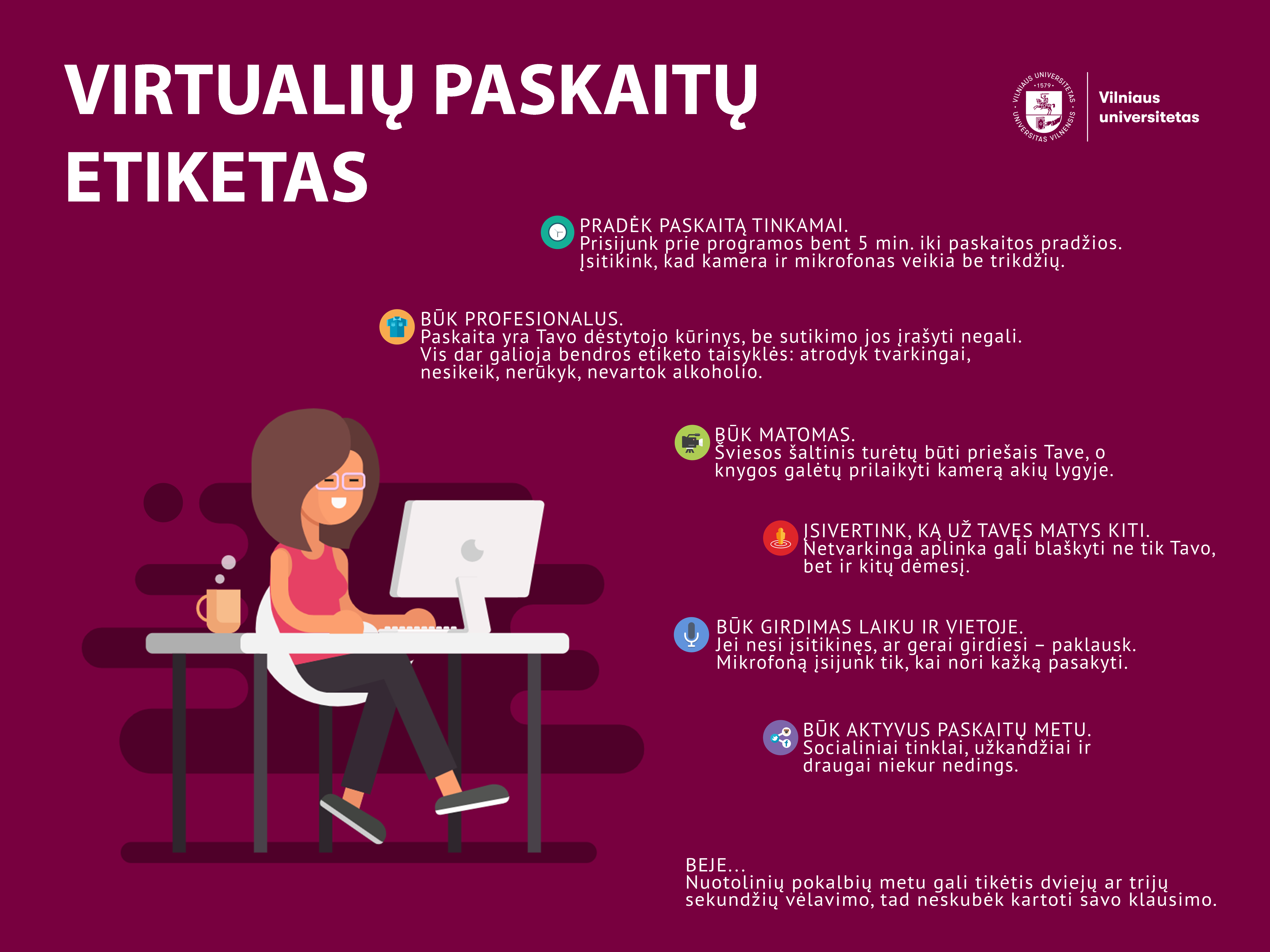 | Vilniaus universiteto dėstytojų vedamos paskaitos ir joms parengta medžiaga yra intelektinė nuosavybė, todėl studentai gali šia informacija naudotis tik mokymosi tikslais. Bet koks kitoks medžiagos panaudojimas, įskaitant jos platinimą be atskiro leidimo yra draudžiamas. Labai prašome jūsų laikytis abipusės pagarbos ir aktyvaus įsitraukimo principų. Produktyvus nuotolinis ar mišrus mokymasis yra mūsų visų bendrų pastangų rezultatas. Dėl to kviečiame į nuotolinius užsiėmimus jungtis su nuostata mokytis, iš anksto pasirūpinti techninėmis detalėmis ir laikytis nuotolinio darbo etiketo. |
