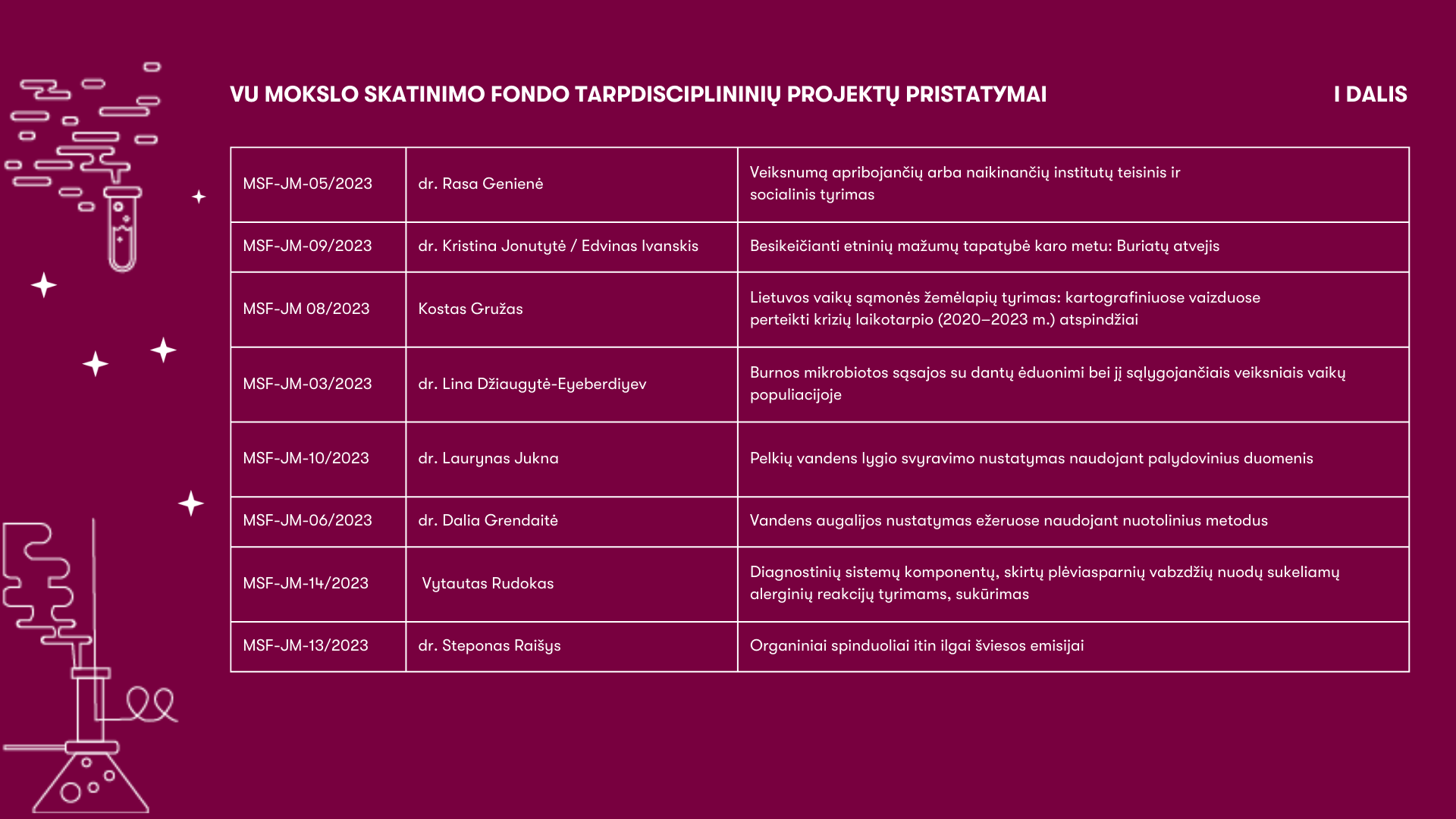· Dr. Gintarė Batavičiūtė, UAB „Lidaris” projektų vadovė, „Mokslo įkvėptas verslas: arba kodėl svarbu daužyti lazerių optiką"