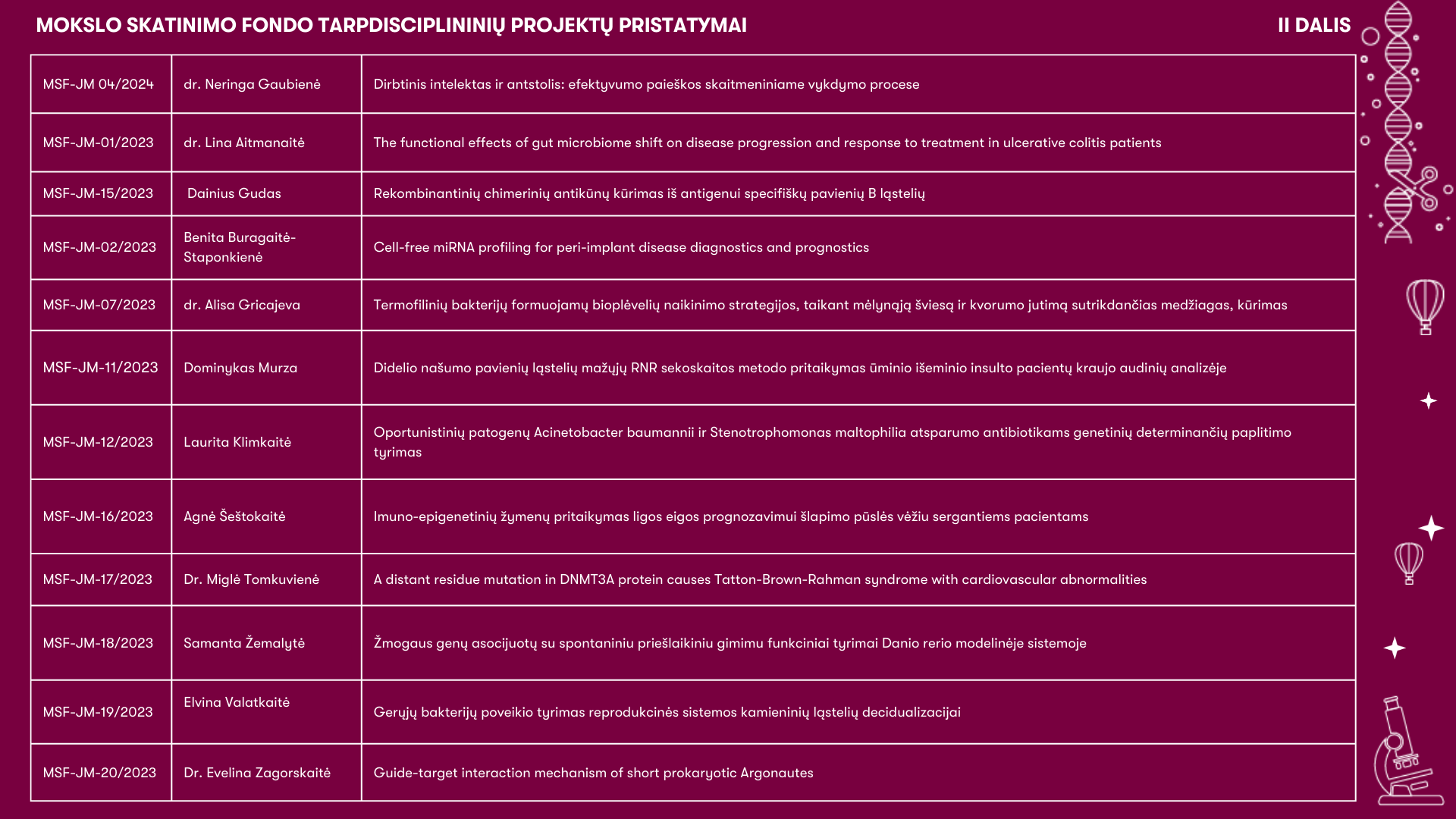 · Laurynas Karpus, UAB „Biommater Designs”, „Programuojama biologija: naujų baltymų kūrimas dirbtinio intelekto pagalba“